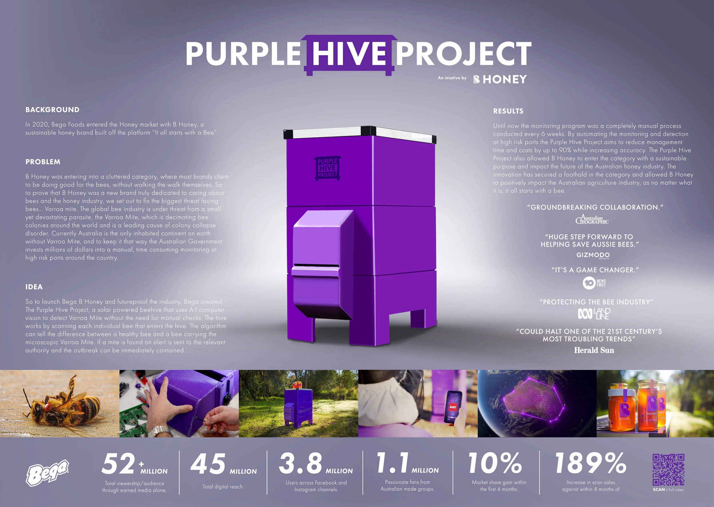 The Purple Hive Project is an AI enabled, solar-powered hive capable of detecting the Varroa Destructor (a type of Mite), a small yet devastating parasite that is decimating bee colonies around the world. The Mite is also known to transmit viruses amongst honeybees.