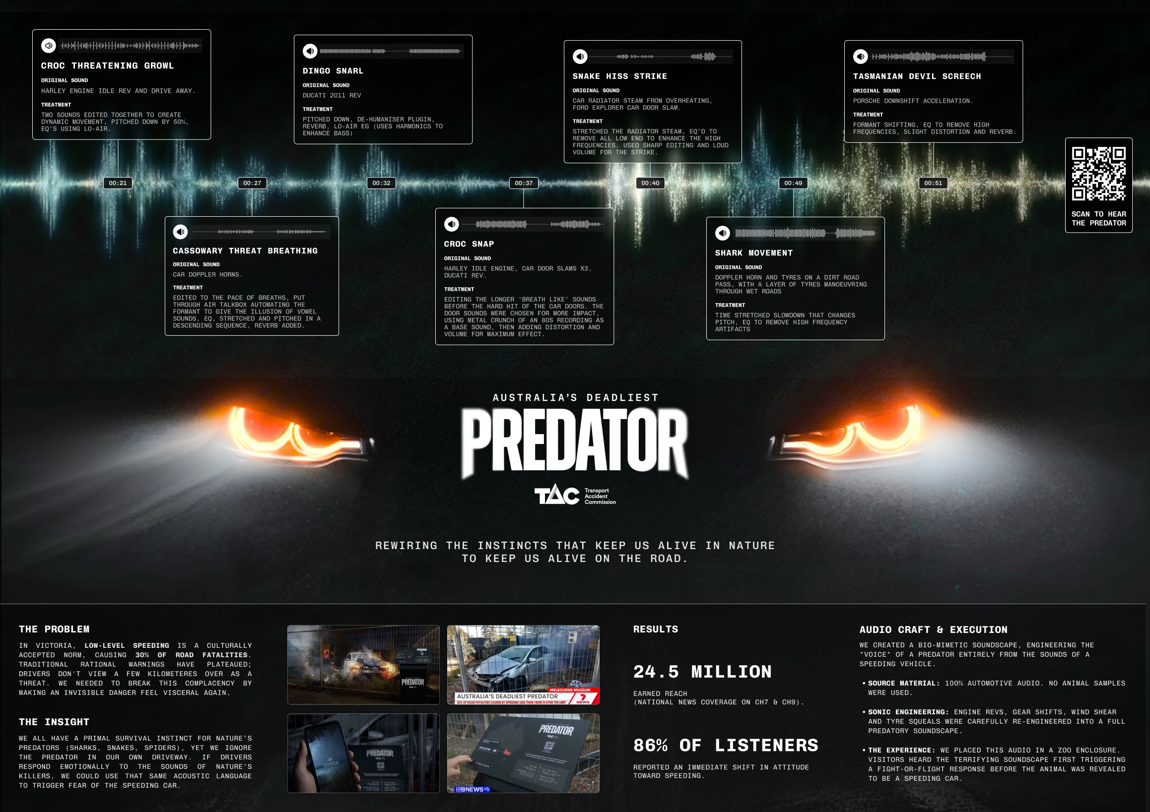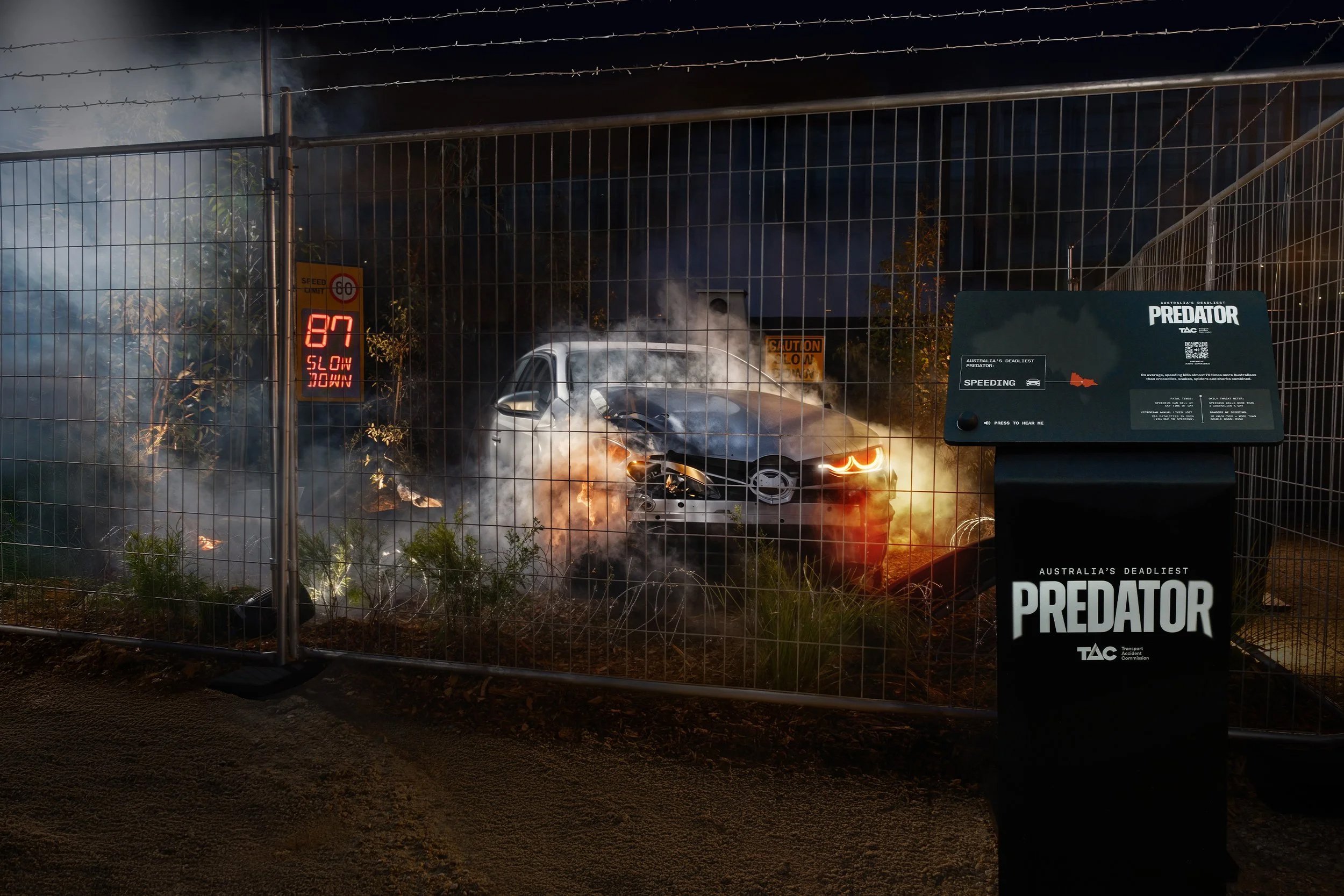 An accompanying immersive audio experience, accessible on-site or via personal devices, guides listeners through the chilling reality of how a small speed increase can spiral into tragedy. People will also experience the project across multiple other touchpoints, asking people to consider Australia’s greatest predator.